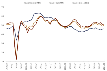 欧元区经济持续低迷 通胀预期下行 市场对欧央行降息预期维持在高位 上周公布的10月PMI数据显示欧元区制造业持续低迷,服务业增长继续放缓。而虽然德国制造业下降速度略有缓解,但失业人数有所增加;法国商业活动则加速萎缩。具体看,欧元区10月制造业PMI初值录得45.9,小幅超过预期和前值的45;10月服务业PMI初值录得51.2,不及市场预期和前值的51.4。而10月综合PMI初值录得49.7,和市场预期持平(图表12)。而两个核心成员国表现不一,具体看,德国10月制造业PMI初值录得42.6,好于市场预期的40.8和前值的40.6。服务业PMI初值录得51.4,同样好于市场预期的50.6和前值的50.6。综合PMI初值录得48.4,也好于预期和前值的47.5。虽然德国综合PMI指数从9月份的最近7个月低点有所回升。但该数据仍然连续4个月低于50的荣枯线。而制造业下降的速度尽管与上月相比略有缓解,但仍处于历史低点。而法国经济则在四季度初仍处于萎缩状态。10月法国综合PMI跌至2024年以来的最低水平,这也是连续第二个月低于50的荣枯线。具体看,10月法国服务业PMI初值录得48.3低于市场预期的49.9和前值的49.6;制造业PMI初值录得44.5,同样低于市场预期的45和前值的44.6;综合PMI录得47.3,也低于市场预期的48.9和前值的48.6。不过,德国10月IFO商业预期指数有所改善,IFO预期指标从9月的86.4上升至87.3,这也是今年6月以来的最高水平。10月德国企业信心指数录得86.5,同样好于市场预期的85.6。通胀方面,欧央行9月对欧元区消费者的通胀预期调查显示[10],未来12个月的通胀预期自8月的2.7%下降至2.4%,这也是2021年9月以来的最低水平。三年通胀预期同样从2.3%降至2.1%,这也是俄乌冲突以来的最低水平。在此背景下,上周路透报道称[11],欧央行官员开始讨论是否要将利率下调至能刺激经济活动的水平。虽然距离达成共识尚有距离,但有一小部分欧央行官员认为欧央行在放松货币政策方面已经落后,这可能意味着需要更大幅地降息,以防止通胀低于2%。目前OIS市场对ECB今年12月降息的预期维持在35个基点左右(市场依旧预计有40%的概率降息50基点),而对明年6月前的降息预期大体维持在120基点附近(图表13)。欧元在本周经济数据公布过后一度跌破了1.08。