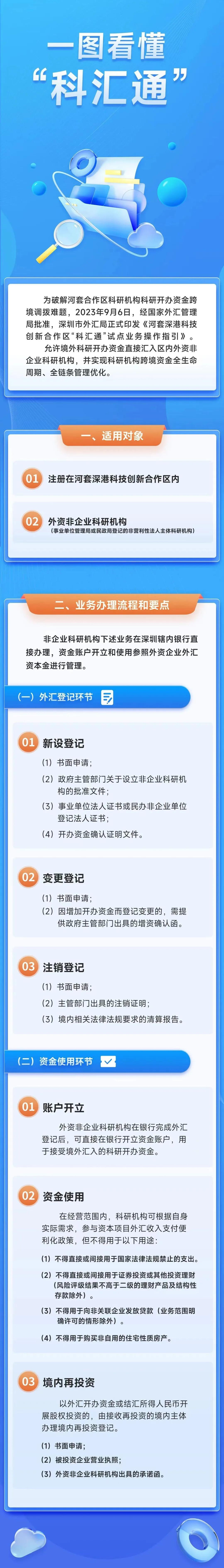 此外,2023年9月6日国家外汇管理局批复,国家外汇管理局深圳市分局正式印发《河套深港科技创新合作区“科汇通”试点业务操作指引》,河套“科汇通”试点正式启动。河套“科汇通”试点主要内容包括: