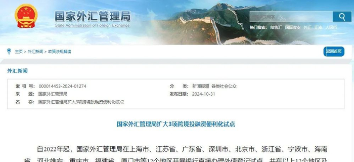 为深入贯彻落实党的二十届三中全会精神和9月26日中央政治局会议部署要求,日前,国家外汇管理局在总结前期试点经验的基础上,决定将开展外商投资企业境内再投资免登记试点和银行直接办理外债登记试点的地区扩大至天津市、安徽省、山东省(含青岛市)、湖北省和四川省,将“科汇通”试点地区扩大至上海市、北京市、天津市、河北雄安、南京市、苏州市、杭州市、合肥市、武汉市、长沙市、广州市、重庆市、成都市、绵阳市、西安市和深圳市等16个地区。