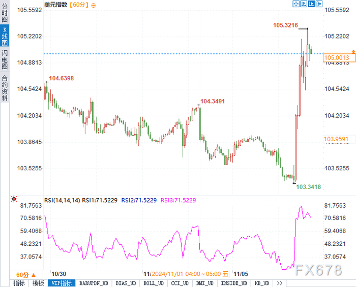 截至北京时间15:48,美元指数上涨1.63%至105.04,盘中一度触及105.19,这是四个月来的最高水平。分析师普遍认为特朗普的政策会提升通胀预期,从而支持美元上涨。Convera的资深外汇交易员James Kniveton指出,“随着特朗普可能上任,市场预期地缘政治将更为动荡,贸易相关货币可能会受到更多冲击。”