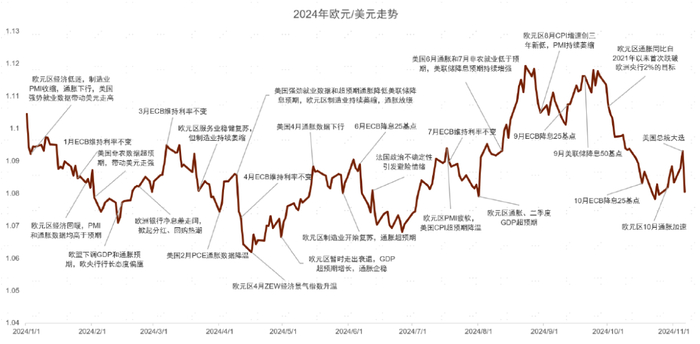 2024年至今欧元/美元整体处于1.06-1.12 的区间震荡行情,今年8/9月期间欧元曾经一度走高至年内高点1.12附近。截至11月8日收盘,欧元兑美元收跌2.91%,在G10货币中排名第3(仅次于美元,英镑)。