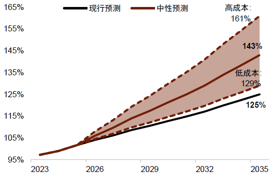 更激进的财政政策与更高的美债利率中枢 特朗普的竞选纲领[1]主要提到了减税、国防支出增加、强化边境安全及实施关税等多项政策,均可能会对未来几年的美国财政产生深远影响。根据美国智库机构CRFB的测算[2],特朗普计划扩展并修改《减税和就业法案》(TCJA),并计划永久化,预计在未来10年增加约5.35万亿美元的赤字。提议免除加班收入、社保福利和小费的税收,这些措施可能导致额外1.3万亿到5.8万亿美元的赤字。将国内制造企业的公司税率下调至15%,增加赤字约2,000亿至6,000亿美元。在支出方面,特朗普政府计划中的军费支出将明显增加,包括现代化军队和导弹防御系统的建设,预计增加4,000亿至2.45万亿美元的支出。加强边境安全和大规模驱逐非法移民,可能导致赤字增加约3,500亿至1万亿美元。为了增收特朗普计划实施全球统一关税,CRFB预计在2026-2035年间增加约2,700亿至4,300亿美元收入,以抵消部分赤字。而他计划取消教育部并支持择校,减少浪费和欺诈行为,共计节约约3,700亿至5,500亿美元。根据该机构的中性估计,特朗普的政策在2026至2035年将导致联邦债务增加约7.75万亿美元,债务总量将从GDP的102%上升至143%。在乐观估计下,赤字增幅约为1.65万亿美元;而在悲观估计下,这一增幅可能高达15.55万亿美元,使债务占GDP比例达161%(图表8)。我们认为,激进的财政政策或导致更多的国债发行,并且增加关税等增收的政策也会在短期内推高通胀,并扰动美联储的降息周期。这都会导致一个更高的美债利率中枢。由于降息预期和美债收益率的变化是这轮美元汇率波动的核心影响因素。因此,尽管2025年美元先下后上的大方向仍然可能会维持,但我们判断特朗普政策的财政政策可能会令美元指数的波动中枢显著抬升,美元指数可能在2025年都维持在100以上。