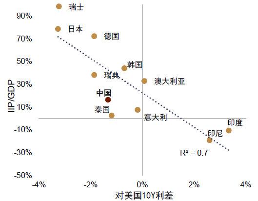 新特征背后的原因 我们认为,人民币汇率之所以呈现出一些类似日元和瑞郎等避险货币的特征,其背后的原因一个是因为中国的高经常项目顺差所导致的净海外资产累积,另一个则是中美利差倒挂背景下,中资企业和机构加速对海外的资本输出。
