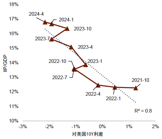 中美利差倒挂所带来的对外资本输出或是人民币汇率呈现避险属性的催化剂。随着2022年美联储开启加息周期,中美利差逐步陷入倒挂,NFA盈余亦随之累积(图表17)。通过对全球主要国家相关指标的横向比较,我们发现各国的NFA/GDP水平与本国对美国的利差密切相关,或是由于更深的利差或意味着可以通过本币融资,并利用外币投资以获取更高的收益。我们发现,瑞士、日本等国拥有最高的NFA对GDP比例,这与其货币具有避险属性相符,且与美元利率的倒挂程度也最深(图表18)。利差的深度倒挂加剧了中国主体的资本输出。从数据上看,2022年以来,中国金融机构的境外贷款余额明显增长,2022年、2023年增速分别为36.4%和32%,2024年前三季度较去年末亦增长7%。