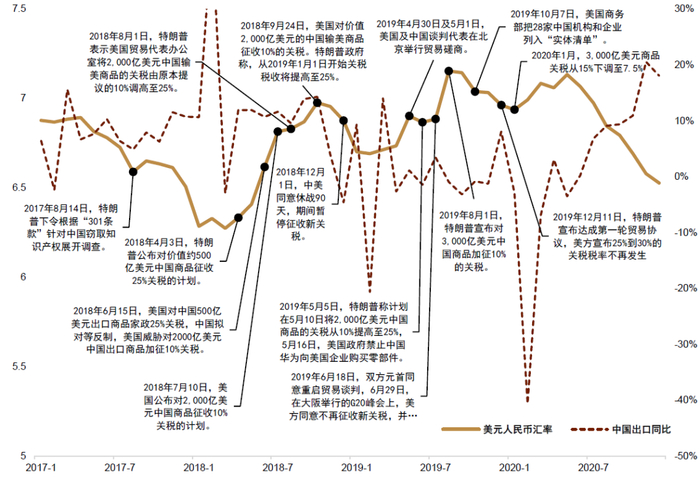 关税或分批逐步加征,节奏多有反复 复盘特朗普上一个任期的对外经贸政策,我们认为这次特朗普不一定在2025年1月上任后立即对华加征关税,因此在关税正式落地前,人民币汇率或存在阶段性的回升机会。而关税的落地可能是分批次的逐步加征,因此即使关税落地对人民币汇率造成一定冲击,其变动的路径也可能会受到双方谈判节奏的扰动,汇率在此期间可能会对相关信息高度敏感,出现阶段性的波动率提升。回顾特朗普的上一个执政周期(图表19),我们可以得出几个经验,第一点是关税的加征并不是在2017年1月特朗普上任总统后立刻发生的。美国对华正式大规模加征关税的时间点是特朗普上任1年多以后得2018年6月。在此前,中美双方有过几轮接触。因此,我们判断,2025年特朗普政府正式上任后,或许不会立刻对华加征关税。而是会留出一定时间进行相关程序或与中方接触。第二点是关税的加征并不是一步到位的,而是分批循序渐进地加征。在特朗普政府的上一届任期中,美国对华加征关税从首批500亿美元的出口商品开始,逐步扩展到第二批2,000亿美元的出口商品和余下价值约3,000亿美元的出口商品。其具体品种和税率也根据商品的可替代性进行排除和区分。因此,我们判断60%的关税或不会针对所有的中国出口商品加征。且加征关税可能是一个分批次的过程。第三点是中美的经贸磋商会不时影响汇市情绪,令汇率双向波动。在特朗普政府的上个任期中,双方会在贸易摩擦期间进行多轮磋商。如果谈判取得实质进展,人民币汇率会出现阶段性反弹。而谈判的过程则由易到难,一开始谈判的进展较快,而随着谈判进入深水区,美方往往会加大施压力度扰动汇率预期。我们判断,即使关税加征落地,中美双方也可能会在2025年举行多轮经贸磋商,期间人民币汇率并不会单边贬值。