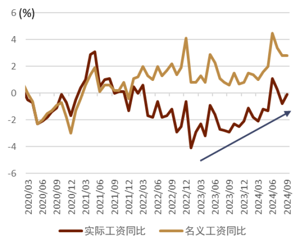截至2024年9月日本的综合CPI同比为2.5%、通胀已经连续30个月高于2%以上,彻底走出通缩的迹象愈发明显。通胀当中目前成本推升与需求拉动的因素贡献基本平分秋色。2024年“春斗”实现了约5%的涨薪幅度,为90年代初以来的最高涨幅(图表25)。此外,日本的实际工资同比也在往正值方面推移(图表26),我们认为“涨薪涨价正循环”正在日本形成。我们认为2025年的“春斗”或能继续取得4%以上的涨薪幅度,通胀或继续停留在2-3%之间,“涨薪涨价正循环”或持续。受日本需求温和扩大,但劳动年龄人口持续减少的影响,日本劳动力持续短缺,企业不得不通过涨薪的方式来获取人才。实现涨薪之后企业还将进行成本转嫁,继续对其产品进行涨价,最终会带来CPI的上涨。