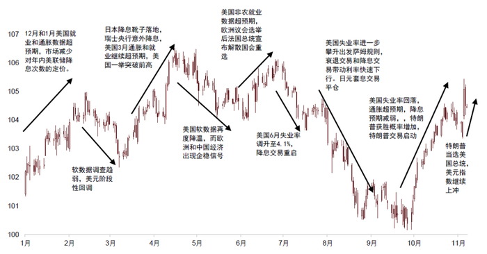 ► 2024年,美元指数大体上经历了先上后下的变化,主要受美联储政策预期的变化所带动。