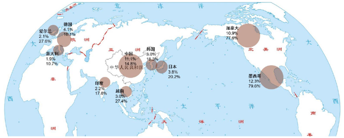 注:数据为2023年;国名下第一行数字为该国占美国进口比例,第二行数字为该国对美贸易依存度;气泡大小根据该国占美国进口比例确定