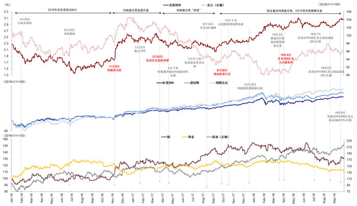 就任后,政策的推进先后将直接决定“特朗普交易”暂缓还是逆转。以上一轮的经验为例,2017年1月就任后,特朗普交易开始暂缓。3月下旬被特朗普置于优先工作重心的医改在众议院共和党内部意外遭遇挫折,成为特朗普交易暂缓的转折点;9月底发布税改框架并于12月22日签署,特朗普交易再度重启,2018年3月关税生效则直接导致铜价大跌。医改这次并非工作重心,因此这几项关键政策的推进先后和顺利程度将直接决定特朗普交易的进展:1)对于风险偏好有明显提振作用的减税和基建等政策如果推进顺利,可能会进一步强化美债、美元、美股与顺周期板块的表现。反之亦然,美债和美元在当前位置本身就提供一定“反着做”交易性机会,如果上述政策推进顺序延后或并不顺利,可能会使得反向交易更加剧烈;2)关税与移民政策如果推进较快且幅度远超预期,可能会强化对通胀的担忧,以及贸易对手方资产的扰动。结合上文中对不同政策的推演,我们倾向于在就任后短期出现暂缓甚至逆转,然后等待政策进展后重启。