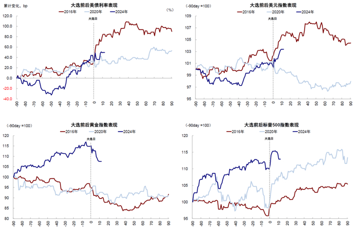 图表:黄金计入的预期过多且和风险偏好提升方向相反,因此存在透支风险,2016年和2020年两次大选也是如此