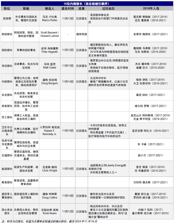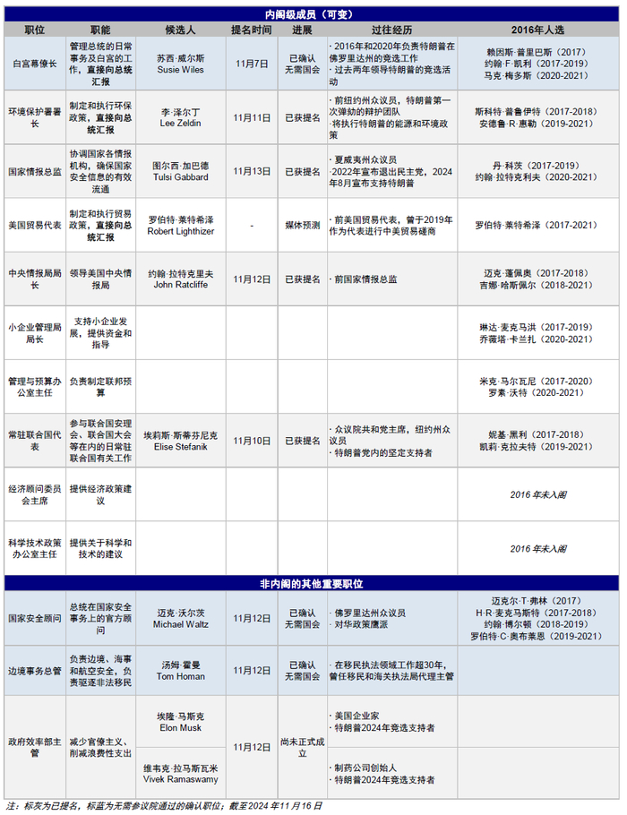 相比第一届任期,此次特朗普第二个任期内的班底提名体现了几个特点:1)组阁速度快,白宫幕僚长一职在大选日两天后便已经确认,截至11月16日,内阁15位部长提名已经接近过半,内阁级成员也已经提名5位,而2016年完成同等进展花费了至少3周以上。其中,关键的人员如国务卿马克·卢比奥(Marco Rubio)、国家安全顾问迈克·沃尔茨(Michael Waltz)等负责外交事务且政策立场强硬的官员,也引发了市场的担忧。
