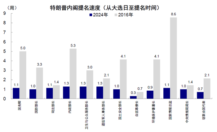 图表:特朗普本次胜选后的组阁速度加快,过去一周内已提名的内阁官员在2016年平均提名时间则长达3.4周