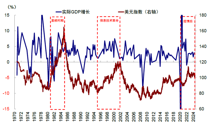 从宏观环境上,当前美国和全球经济面临的环境也与2016年截然不同。过去三年,美国“偶然”促成的三大宏观支柱:大财政、科技创新与全球资金再平衡,是美国经济与美股持续强劲的核心原因。这与里根时期强劲的增长、大规模的财政赤字与贸易逆差(“双赤字”),但美元维持强势且海外资金不断流入的组合如出一辙,形成相互加强的“里根大循环”,其本质是通过大财政和资金回流提振美国资产,但也加大了其他市场的压力,形成美元与非美资产的反差,而特朗普的诸多政策主张有可能会强化甚至固化上述三个宏观支柱。当然,这一局面并非稳态,会增加美国的债务负担与不持续性,也会增加全球贸易体系的脆弱性。因此这才有了后来的“广场协议”美元竞争性贬值,日元和德国马克大幅升值并加大内需刺激。但在此这一脆弱平衡被打破之前,“里根大循环”对于全球资产的影响是深远的。