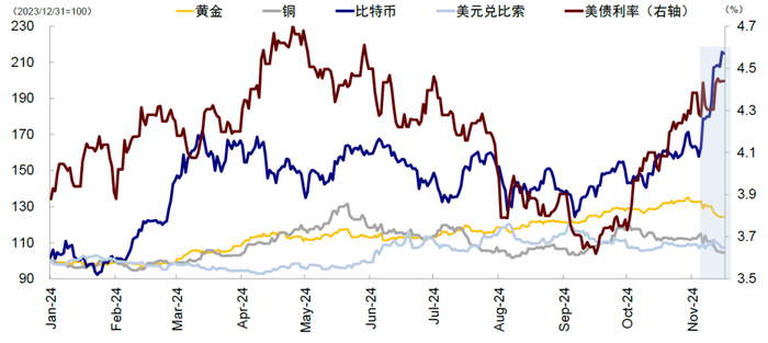 自特朗普11月6日胜选以来,市场预期可能很快“利好兑现”的特朗普交易不仅并未消退,反而不断强化,美债利率逼近4.5%,美元指数突破107,比特币大涨,黄金大跌,连此前反应不大的中国市场和人民币也开始明显承压,这与我们在《Trump 2.0对全球意味着什么?》中提示特朗普交易在短期仍有惯性、尤其是预期计入不足的资产,如黄金、中国市场和出口链或面临更多压力的判断一致。