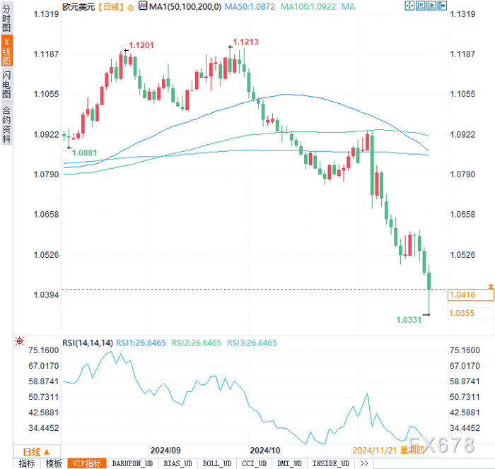 欧元兑美元跌至两年低点1.0416,盘中触及1.0333的低位。欧元区11月综合PMI降至48.1,反映出制造业和服务业均陷入萎缩,显示经济正在加速失去动力。
