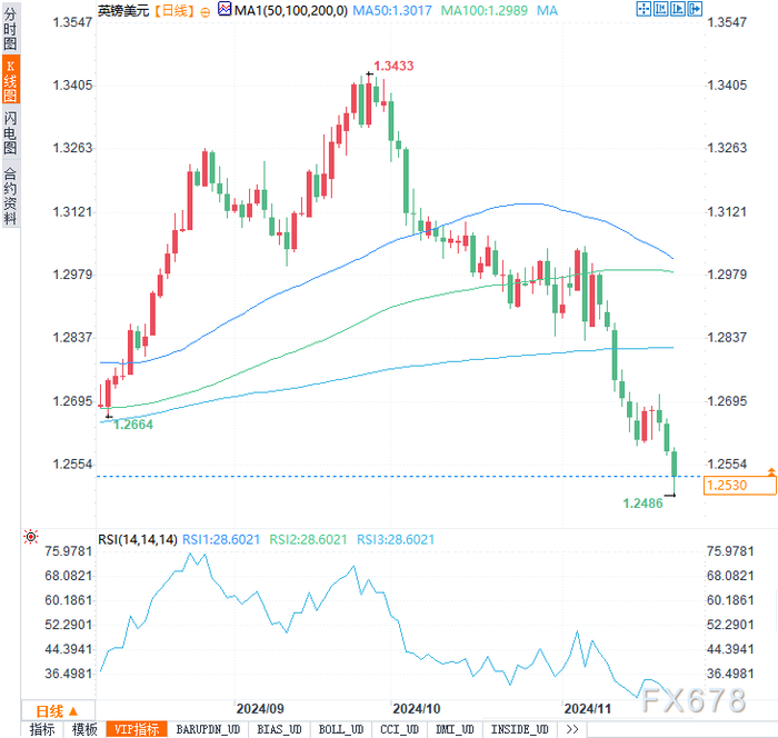 英镑兑美元跌至1.2528,同样受制于疲弱的PMI数据。英国11月PMI降至49.9,为一年多来首次跌破50荣枯线。英国政府对企业增税的计划进一步削弱了私营部门的活力,加剧了市场对经济衰退的担忧。