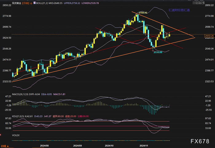 汇通财经APP讯——上周(1125-1129当周),金价收跌2.36%至2650.26美元/盎司,虽然五天中四天收阳,但弱弱反弹依然未能抵消其周一的暴跌,因11月25日盘中一度暴跌近4%并收跌3.28%,创近六个月(6月7日收跌3.48%以来)最大单日跌幅。直接触发因素是特朗普提名著名投资人贝森特(Scott Bessent)担任美国财政部长,该人物主张税制改革和放松管制,严厉关税的可能性或降低,避险买需降低。而更完美的配合条件是,金价自2541到2723这段的反弹已来到重要压力位。基本面和技术面共振触发了暴跌。