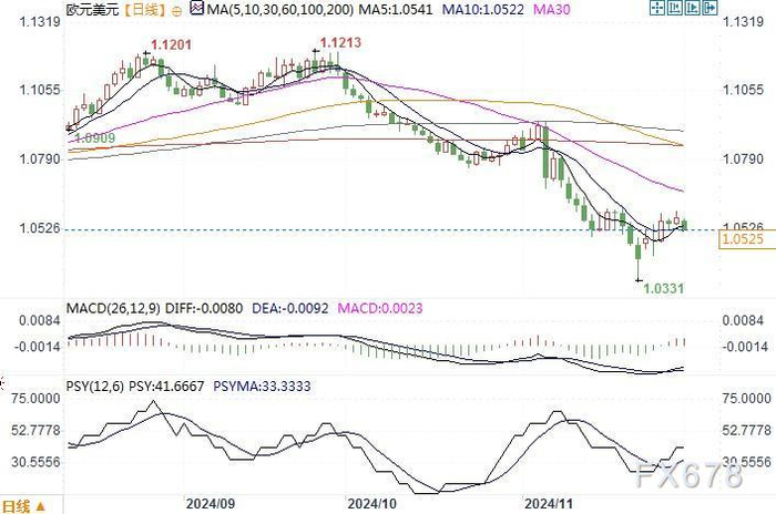 欧元兑美元日线图来源:易汇通北京时间12月2日11:02 欧元兑美元 报 1.0524/25。