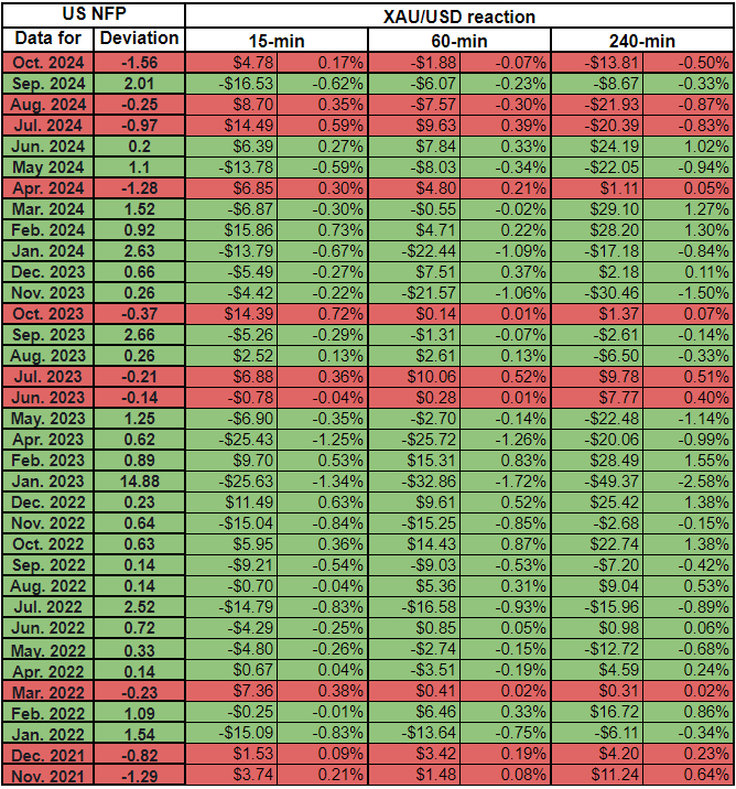在其他资产方面,非农好坏对汇市、债市和贵金属市场的影响,可能比股市更为容易判断一些。通常若非农数据好于预期,将利好于美元和美债收益率,反之亦然。而黄金等资产则料将大致与美元反向。以下是此前不同非农数据偏差下,黄金在历次非农发布后半小时、1小时和2小时的波动汇总。