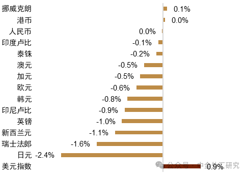 人民币汇率基本录得平盘上周人民币汇率走势在内部因素的支撑下并未发生明显变化,在主要货币中排名明显靠前(图表1),全周走势先涨后跌,贬值压力主要集中在周三(图表2)。从外部环境来看,上周市场调降了对于明年美联储的降息预期,美债收益率及美元指数均走高,对非美货币形成压力。内部环境来看,政治局会议对人民币汇率提振明显,稳汇率政策亦再度明显发力,人民币对一篮子货币升至5月中下旬来新高(图表3)。然而中债收益率下行速率较快,中美利差承受压力,市场预期的扰动也一度造成汇率的明显下跌。