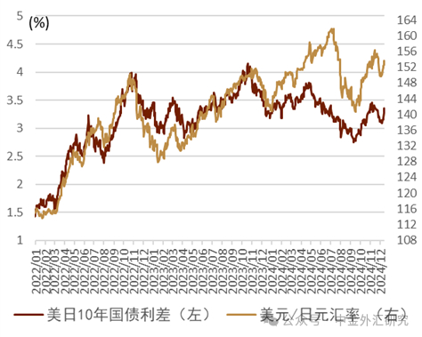 日元为最弱G10货币上周一至周五美元走强与日元走弱持续发生,在此背景下日元成为了周内最弱的G10与亚洲货币。美元走强的背景在于偏强的美国经济数据背景下市场对美联储的降息预期逐步退坡。与此相反,上周受到市场对日本央行12月加息的预期快速退坡,日元发生了明显的贬值。整体来看,上周美日汇率与美元指数、美债利率的联动都相对较强(图表11、图表12)。息差角度来看,美日10年息差与美日汇率12个月掉期点都出现了拐点,反映出美债利率上行幅度大于日债,在此背景下日元也贬值明显(图表13、图表14)。