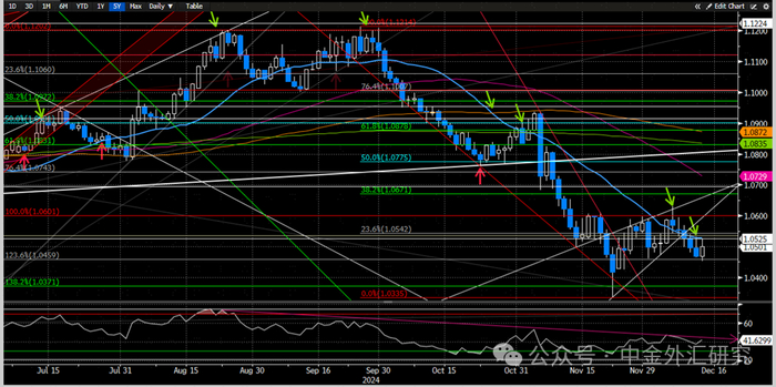 欧元/美元上周符合我们上周一周报中的判断一路连续承压走低至1.0460附近,虽然上周五有所反弹,但依旧未能突破21天均线的近期关键阻力(图表18中蓝色线&最右侧绿色箭头)。向前看,考虑到8月中旬以来RSI指数的下行趋势依旧未能得到逆转,短期内欧元空头可能会继续占据上风。另一方面,欧元自11月末年内低点以来的反弹依旧并未能有效突破1.06附近的关键阻力,而近期关键的阻力依旧位于21天均线。我们认为本周需要关注21天均线能否继续压制欧元,如果欧元多头可以向上突破,那么1.06附近可能成为欧元多头下一个目标,但欧元的反弹动能可能会在38.2%斐波那契回撤位1.0670附近遇阻,我们认为本周欧元可能会继续维持低位震荡。