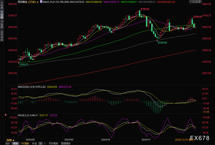 汇通财经APP讯——黄周一(12月16日)亚市早盘,现货黄金窄幅震荡,目前交投于2650.30美元/盎司附近。金价在上周四创下逾五周来新高2726.05后出现获利了结,上周五延续跌势,最低触及2646美元附近,为近一周新低,美债收益率持续走高,并刷新近三周高点,令金价继续承压。