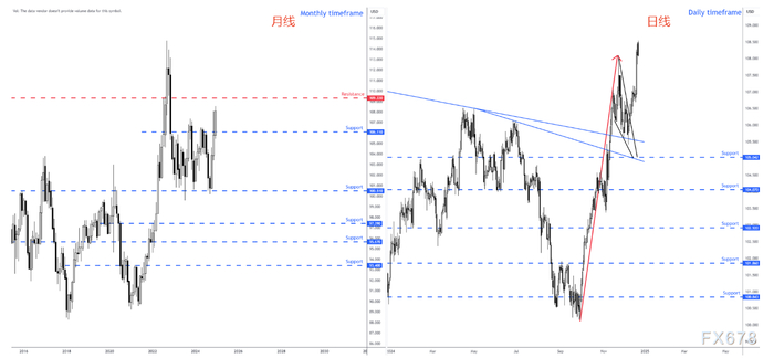 fxblue认为,美元还有上涨空间,将密切关注 25 年第一季度强劲的美元走势。特朗普的当选及其政府提出的促增长政策预计将推高通胀。再加上投资者(和美联储)预计2025年降息步伐将放缓,对美元来说是利多的。