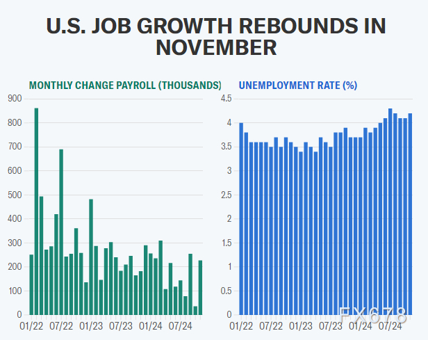 11 月份,美国经济仅增加了 227000 个就业岗位,劳动力市场从影响之前报告的几次天气干扰和工人罢工中反弹。与此同时,11月失业率从 4.1% 升至 4.2%。