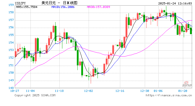 新浪外汇消息2025年01月24日,截至12时15分,外汇市场上美元兑日元汇率跌破1美元兑换155.2060日元。跌幅为-0.5141%