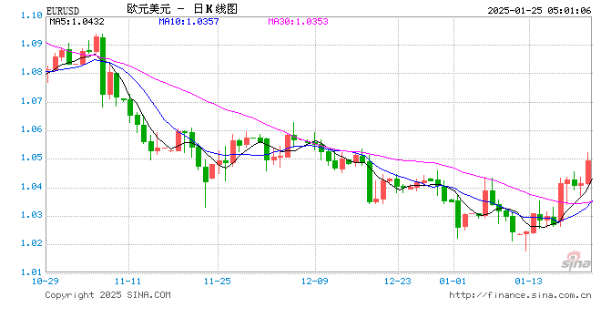 新浪外汇消息2025年01月25日,截至05时01分,外汇市场上欧元兑美元汇率突破1欧元兑换1.0496美元。涨幅为0.7884%