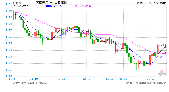 新浪外汇消息2025年01月28日,截至15时31分,外汇市场上英镑兑美元汇率跌破1英镑兑换1.2433美元。跌幅为-0.5034%