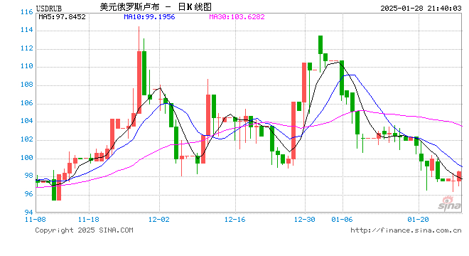01月28日 美元兑俄罗斯卢布突破98.5760 折算100俄罗斯卢布汇率兑7.3800人民币