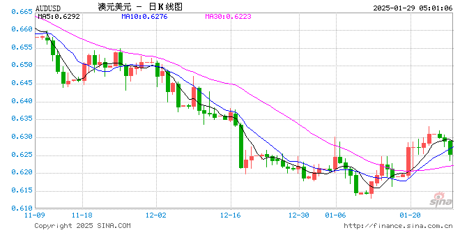 新浪外汇消息2025年01月29日,截至05时01分,外汇市场上澳元兑美元汇率跌破1澳元兑换0.6253美元。跌幅为-0.5898%