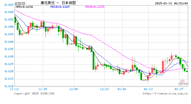 新浪外汇消息2025年01月31日,截至06时51分,外汇市场上澳元兑美元汇率跌破1澳元兑换0.6201美元。跌幅为-0.5070%