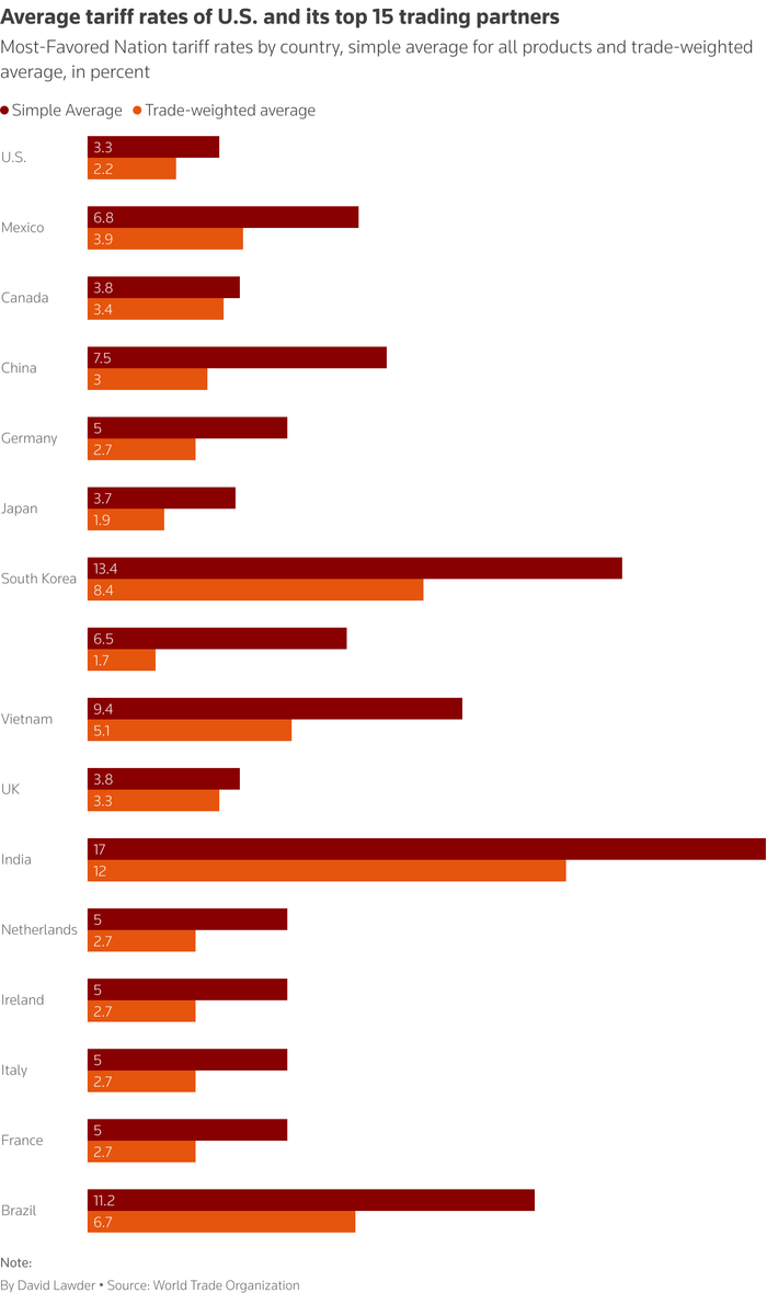 根据世界贸易组织的数据,美国的贸易加权平均关税税率约为2.2%,而印度高达12%,巴西为6.7%,越南为5.1%,欧盟国家为2.7%。