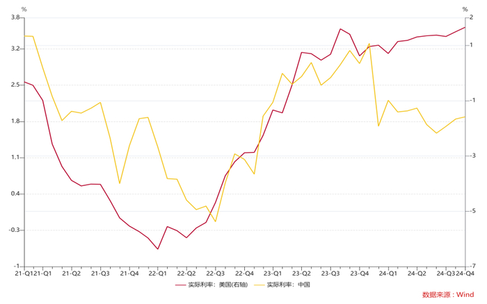2025年,预计中国的实际利率仍有持续下行的可能,而美国经济增长动能放缓,可能会逐渐看到实际利率企稳,走出向下拐点的可能。