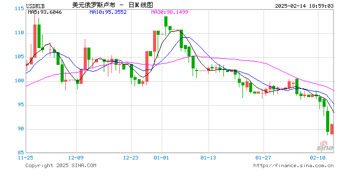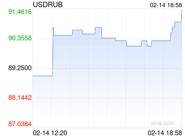 02月14日 美元兑俄罗斯卢布突破91.4250 折算100俄罗斯卢布汇率兑7.9320人民币