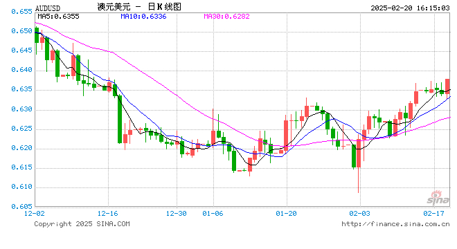 新浪外汇消息2025年02月20日,截至16时14分,外汇市场上澳元兑美元汇率突破1澳元兑换0.6378美元。涨幅为0.5185%