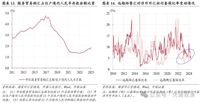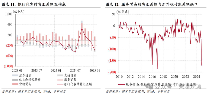 1月份,货物贸易是银行代客结售汇逆差环比扩大的第一大贡献项,该项结售汇顺差由上月350亿降至140亿美元,贡献率为73%(见图表11)。货物贸易结售汇顺差收窄,一方面是因为货物贸易收付款顺差减少,另一方面也源于外贸企业结汇意愿减弱、购汇动机增强。当月,以货物贸易代客结汇占涉外收入比重衡量的收入结汇率连续第四个月下降,由2024年9月份的58.3%降至45.2%,创2016年以来新低;以货物贸易代客售汇占涉外支出比重衡量的支出购汇率为52.2%,为2024年8月以来新高。