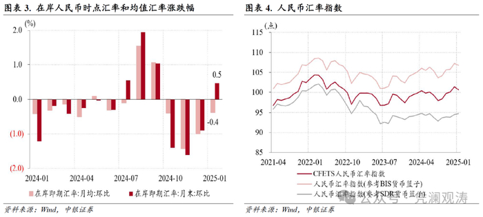 1月份,特朗普关税政策扰动汇市,美元指数高位震荡,人民币时点汇率结束了“三连跌”,但人民币均值汇率继续走弱,汇率指数出现回调。