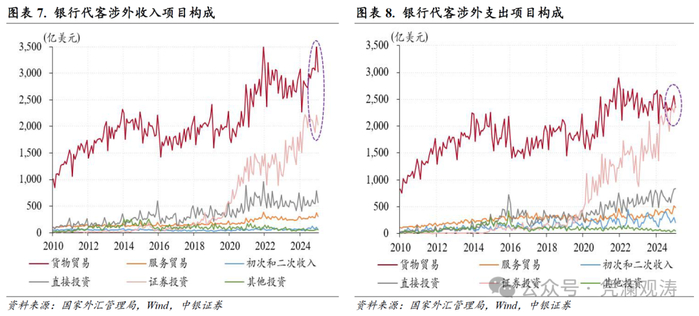分项目看,证券投资、货物贸易和直接投资是银行代客涉外收付款差额逆转的前三大贡献项,贡献率分别为39%、37%和28%。当月,证券投资收付款延续2024年10月以来逆差态势,逆差规模由上月50亿增至371亿美元,其中涉外收入环比减少176亿至2032亿美元,涉外支出增加145亿至2403亿美元,创下历史新高,首次超越货物贸易涉外支出规模,成为第一大跨境资金流出项;货物贸易收付款顺差由上月980亿降至677亿美元,创历史同期新高,顺差环比收窄主要是因为涉外收入从上月3548亿降至3030亿美元,部分反映了春节假期的影响,不过货物贸易仍然是第一大跨境资金流入项,继续发挥稳定跨境资金流动的基本盘作用;直接投资收付款延续2022年7月以来逆差态势,逆差规模由上月35亿增至266亿美元,历史排名第二,仅次于2024年4月逆差295亿美元,直接投资逆差扩大主要是因为涉外收入环比减少224亿美元,符合季节性规律,历史数据显示,直接投资涉外收入年内高点通常出现在12月份(见图表6-8)。