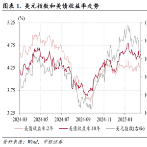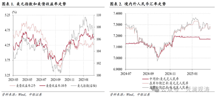 1月份,美元指数总体保持高位震荡:1月1日至10日从108.5一度升至109.7,创2022年11月10日以来新高,1月13日开始回落,其间特朗普在上任首日并未宣布具体关税措施,推动特朗普交易回撤、市场避险情绪收敛,美元指数在27日降至107.3,此后重新反弹至月末的108.5(见图表1)。