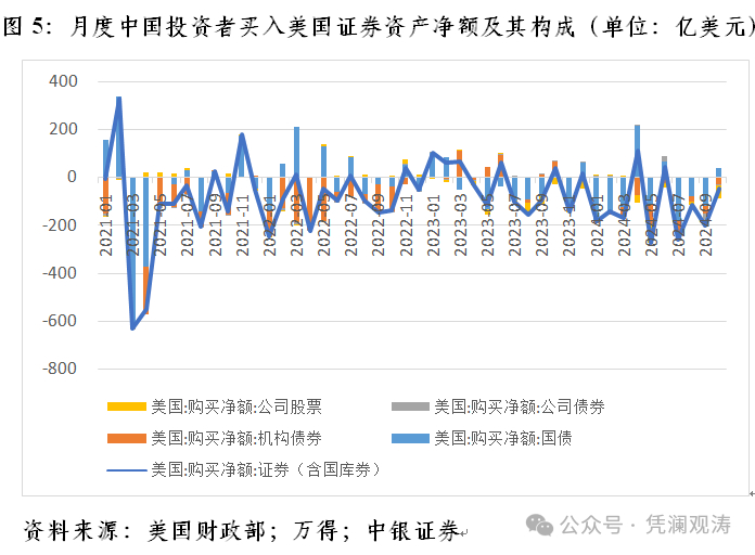 根据TIC统计数据,2024年,外资净买入美国证券(含美国国库券,但不含银行负债变动、买卖外国证券及其他可转让证券海外持有额变动)1.26万亿美元,较上年多增1718亿美元。中国投资者却背道而驰,同期净卖出美国证券1285亿美元,较上年多增985亿美元。其中,净卖出美国政府机构债422亿美元,较上年多增663亿美元,贡献了同期中资净卖出美国证券多增的67.3%;净卖出美国国债(含国库券)581亿美元,较上年多增239亿美元,贡献了23.6%;净卖出美国股票277亿美元,多增74亿美元,贡献了7.5%;净卖出美国公司债4亿美元,多增13亿美元,贡献了1.3%(见图5)。这表明,中国投资者对美股坚定地逢高减仓,并全面降低对美元资产的风险敞口。