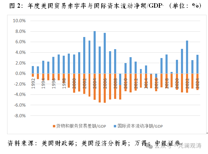 美国国际收支是结构性的贸易收支逆差、资本项目顺差的自主平衡格局。2024年,美国国际资本回流加速与其创纪录的商品贸易逆差有关。当年,美国商品逆差1.21万亿美元,较上年增长14.0%;服务顺差2933亿美元,增长5.4%;商品和服务逆差合计9184亿美元,增长17.0%,与名义国内生产总值(GDP)之比(即贸易赤字率)为-3.1%,这同国际资本流动净额与名义GDP之比3.6%的水平大体相当。对2012~2024年美国商品和服务差额/GDP与国际资本流动净额/GDP的相关性分析显示,二者为强负相关,相关系数为-0.827,表明贸易失衡越严重,美国国际资本净流入越多(见图2)。同时,这也意味着,若特朗普关税致力于纠正美国贸易失衡的话,将抑制国际资本对美元资产的有效需求,二者“两难全”。