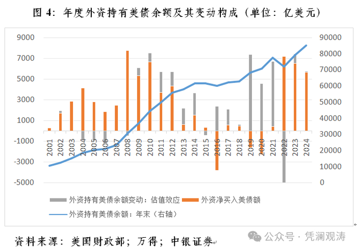 2024年,2、5、10、20、30年期美债收益率分别收涨2、54、70、66、75个基点。鉴于外资持有美债余额中,中长期美债占比八成五以上,而1年期以内的美国国库券不计提估值损益,中长期美债价格下跌,外资持有美债余额按市值重估本应录得负估值效应。如2022年,由于前述各期限美债收益率分别飙升358、273、236、220、207个基点,美债价格大幅下跌,外资持有美债录得负估值效应1.26万亿美元。这导致当年外资净买入美债7166亿美元(仅次于2008年的7724亿美元),但外资持有美债余额下降5426亿美元(见图4)。当时,关于外资抛售美债的说法不胫而走。但这显然是“以讹传讹”。