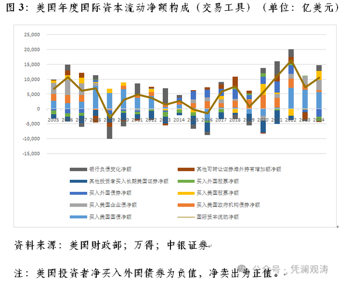 从期限结构看,外资持有中长期美债余额7.31万亿美元,增加4572亿美元,贡献了新增外资持有美债余额的79.7%,其中,净买入中长期美债4492亿美元,正估值效应80亿美元;外资持有短期美国国库券1.20万亿美元,增加1165亿美元。从持有人结构看,私人外资持有美债余额4.73万亿美元,增加5875亿美元,贡献了新增外资持有美债余额的102.4%,其中,净买入美债5377亿美元,正估值效应498亿美元;官方外资持有美债余额3.78万亿美元,减少138亿美元,其中,净买入美债280亿美元,负估值效应418亿美元。需要指出的是,2024年第四季度,官方外资净减持美债394亿美元,相当于同期官方国际资本净流出额的57.0%,再次表明当季国外有关当局或存在抛售外汇储备,实施外汇市场干预的行为。