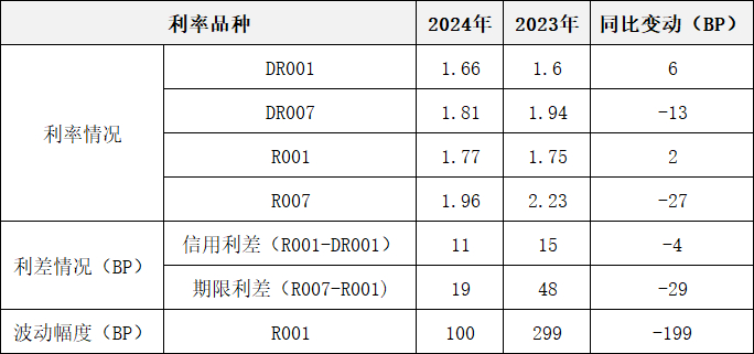 一是市场利率围绕公开市场操作利率总体下行,波动幅度明显降低。从利率水平看,债券回购利率跟随政策利率震荡下行,春节、季末等时点短时冲高后快速回落至政策利率附近。2024年全市场隔夜回购利率R001均值为1.77%,同比上行2BP,全市场7天回购利率R007均值为1.96%,同比下行27BP。从波动幅度看,当年R001波峰与波谷相差100BP,较2023年大幅收窄199BP。