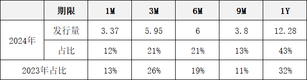 表2 2024年同业存单各期限发行量与占比情况(单位:万亿元)