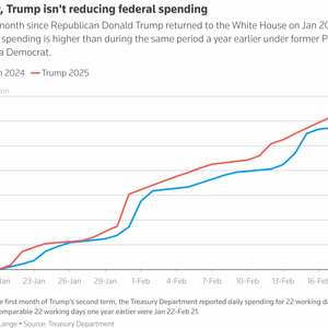 图:特朗普1月20日重返白宫后的一个月,总体联邦支出高于去年同期